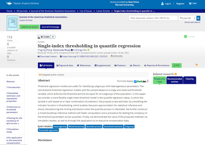 我院青年教師章迎瑩的合作論文《Single-index Thresholding in Quantile Regression》被國際統(tǒng)計學(xué)頂級期刊Journal of the American Statistical Association(簡稱JASA)接收。章迎瑩是第一作者,華東師范大學(xué)是第一署名單位。
